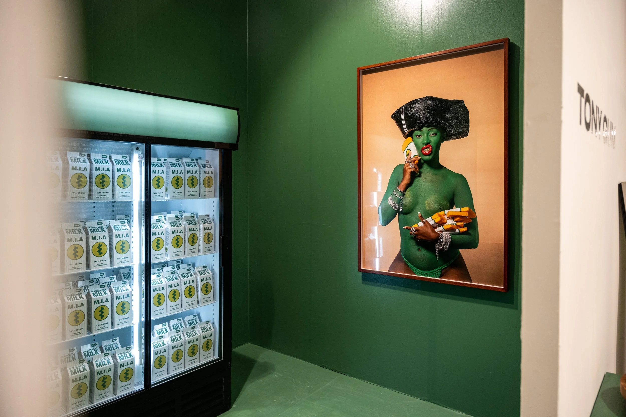 Set with a 3m x 3m space - we created a little quad covered in her signature green - top to bottom - with key feature pieces that would compliment her art showcased inside, almost having her signature props in 3D reality but abstract thought. The mini booth was housed within the greater Christopher Moller Gallery stand at the annual Investec Cape Town Art Fair - the booth design itself created quite a buzz of curiosity - not sure what they’ll see when they peel around the corner.